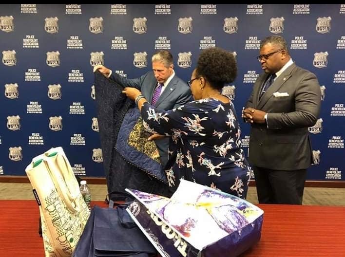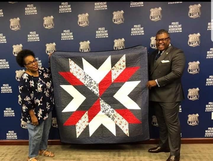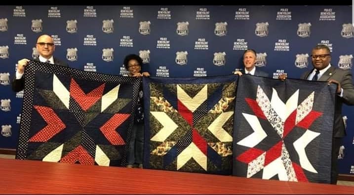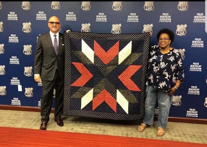 The New York Police Department Police Benevolent Association has been a strong supporter of H.O.P.S as well as The Labor of Love Quilt Project since its inception. Today we honored President Pat Lynch, and N.Y.P.D. Transit Representatives Juan Zubizarreta and Corey Gable with Patrolman’s Star Quilts. It was a beautiful sunny day and we were so happy to acknowledge their support. Thank you again!–September 4, 2019