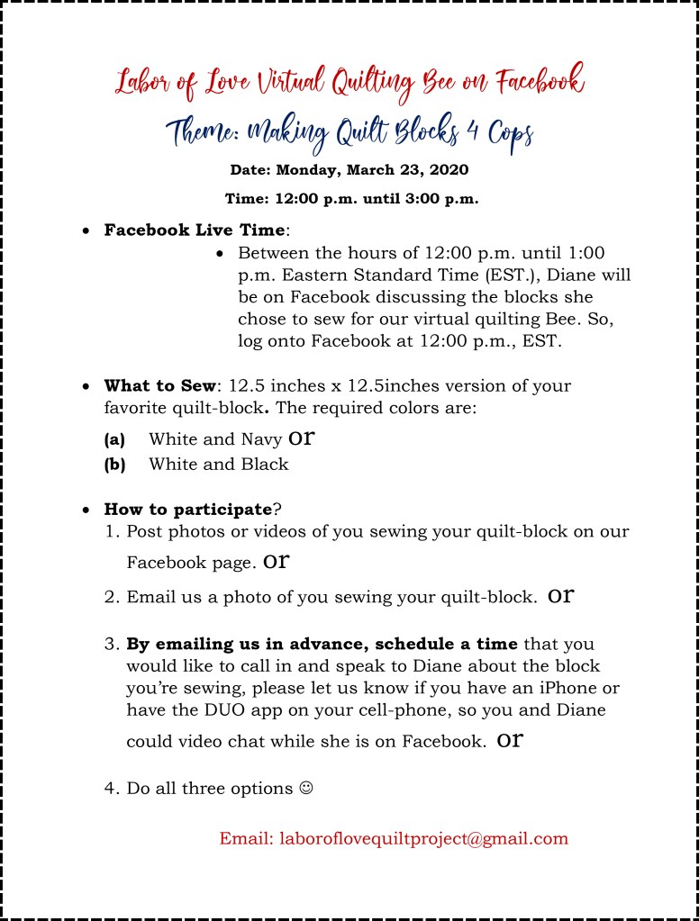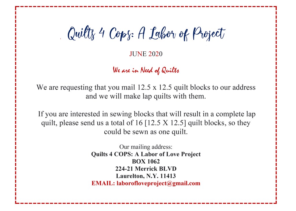 Quilts 4 COPS: A Labor of Love Quilt Project BOX 1062 224-21 Merrick BLVD Laurelton, NY 11413.