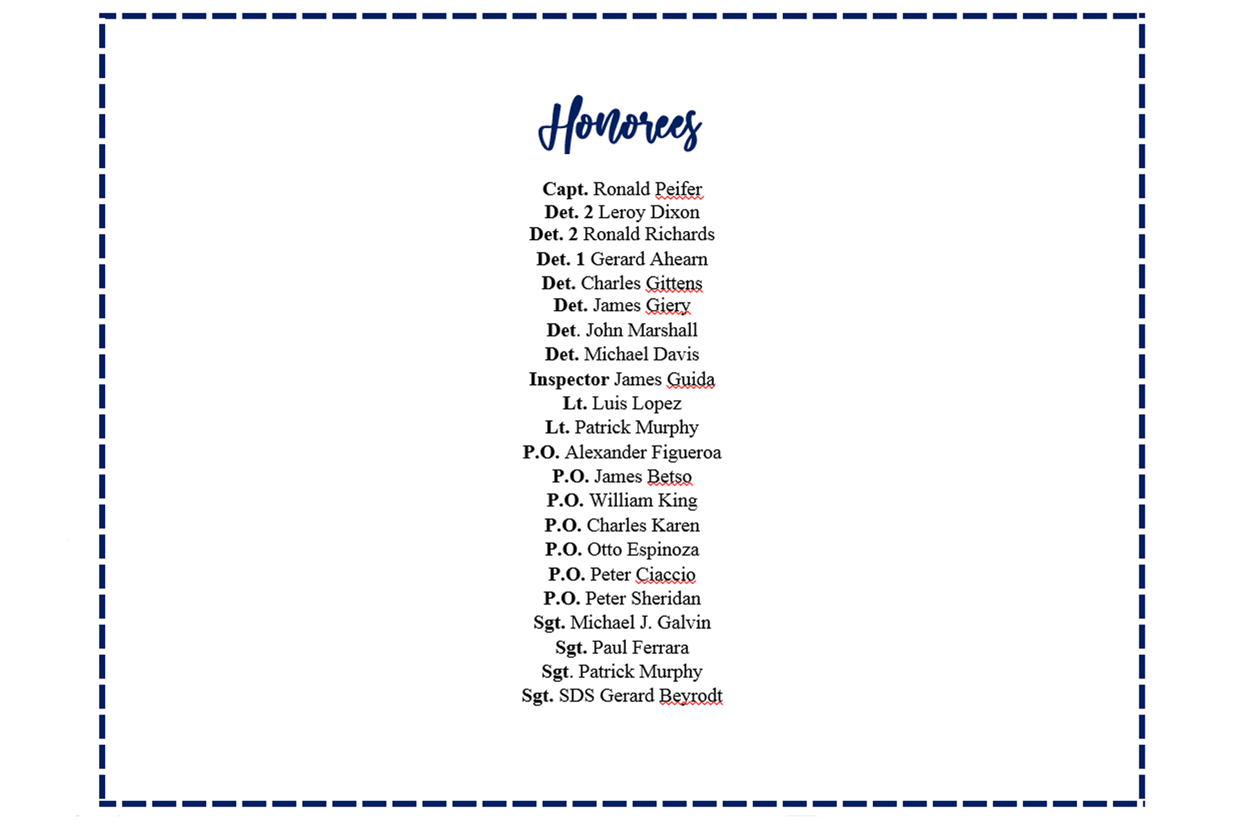 | Inspector Donald Feser Capt. Dennis Morales Lt. Steven Cioffi Sgt. Harold Smith Det. Corey Diaz Det. Edwin Ortiz Det. Joseph Cavitolo Det. James Albanese Det. Joseph Seabrook Det. Kevin Czartoryski Det. Michael Morales P.O. Cheryl Johnson P.O. David Mahmoud P.O. Denis McLarney P.O. Martin Tom P.O. Peter Rodriguez P.O. Renee Dunbar P.O. Ronald Becker P.O. Kevin Lee Supervisor Umberto Corso |