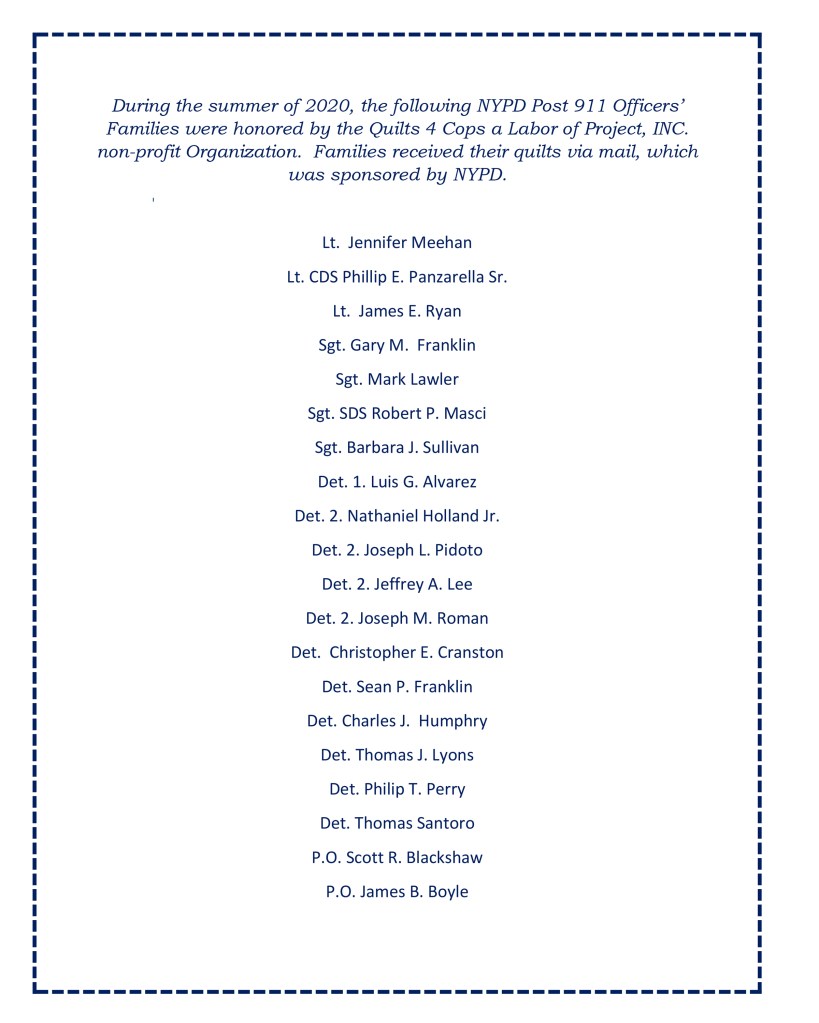 Hello everyone, we hope all is well with you and your families. It’s unfortunate that we could not gather to honor the families with their quilts this year as a result of COVID19; however, the NYPD has been very generous and mailed our Labor of Love quilts to the families of the following NYPD Post 9//11 Officers that should have been honored at 1 Police Plaza during March 2020. . We are very grateful and we look forward to continuing our mission for making Quilts 4 COPS! Quilters, please join us by sewing a 12.5 X 12.5 quilt block using NYPD colors and mailing it to our address: