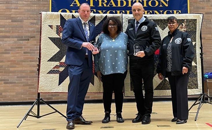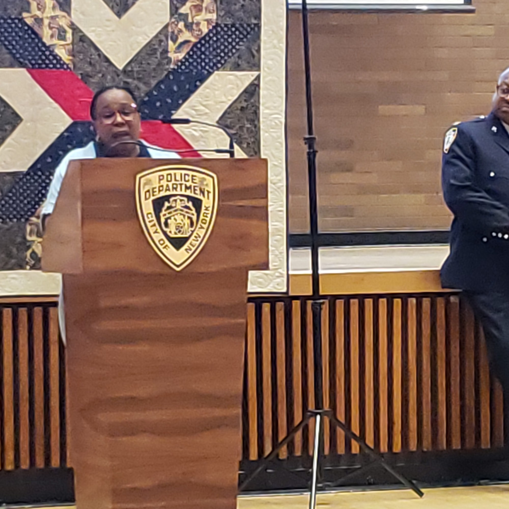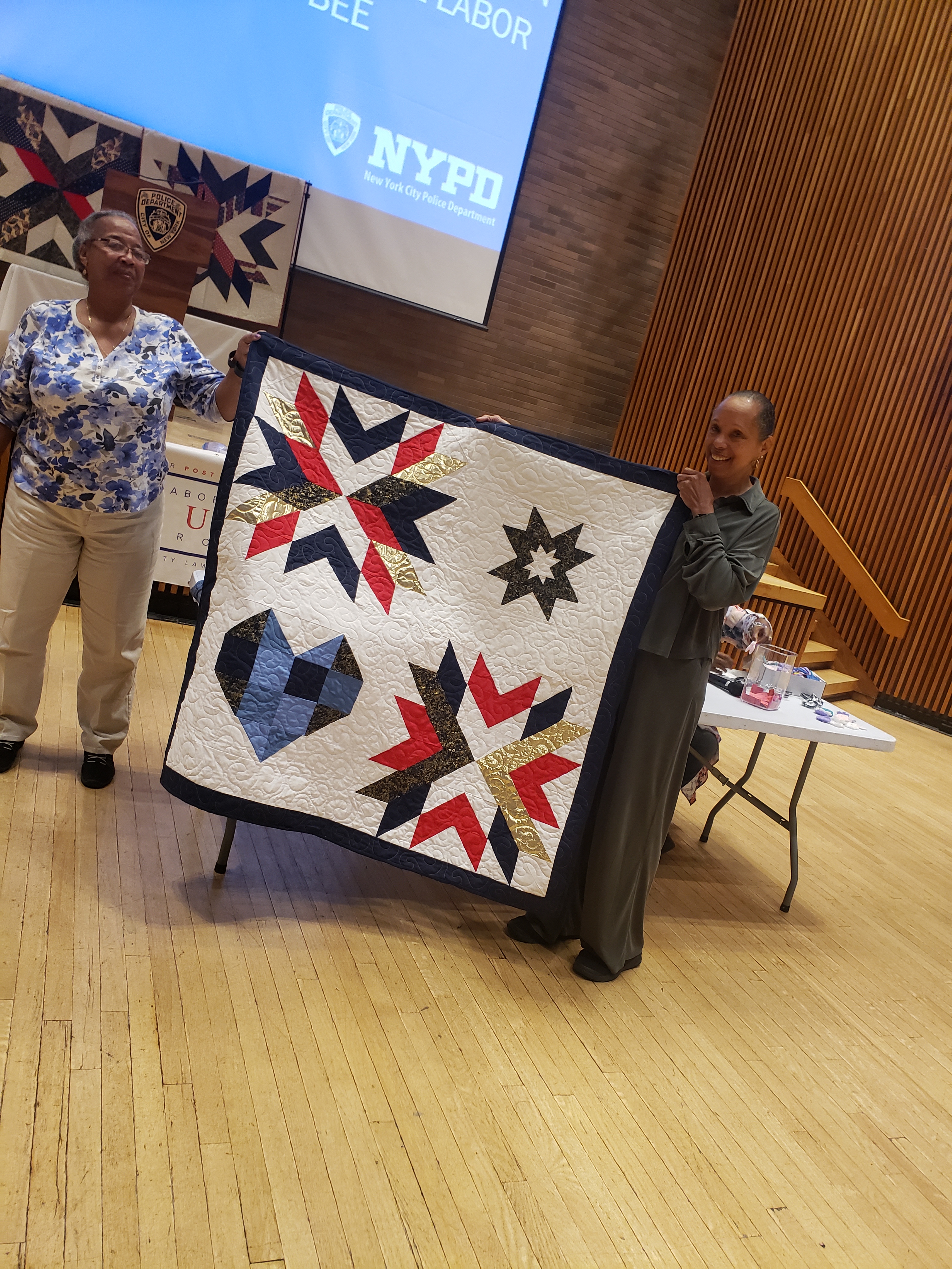 We were greeted by NYPD Commissioner Keechant Sewell, and had a ceremony hosted by Deputy Commissioner for Employee Relations Lisa White, who greeted us and thanked us for our work. The founder of Quilts4Cops, Diane Pryor-Holland was gifted a quilt by Quilter, Barbara McNamara in honor of Diane’s husband, Police Officer, Richard Holland.