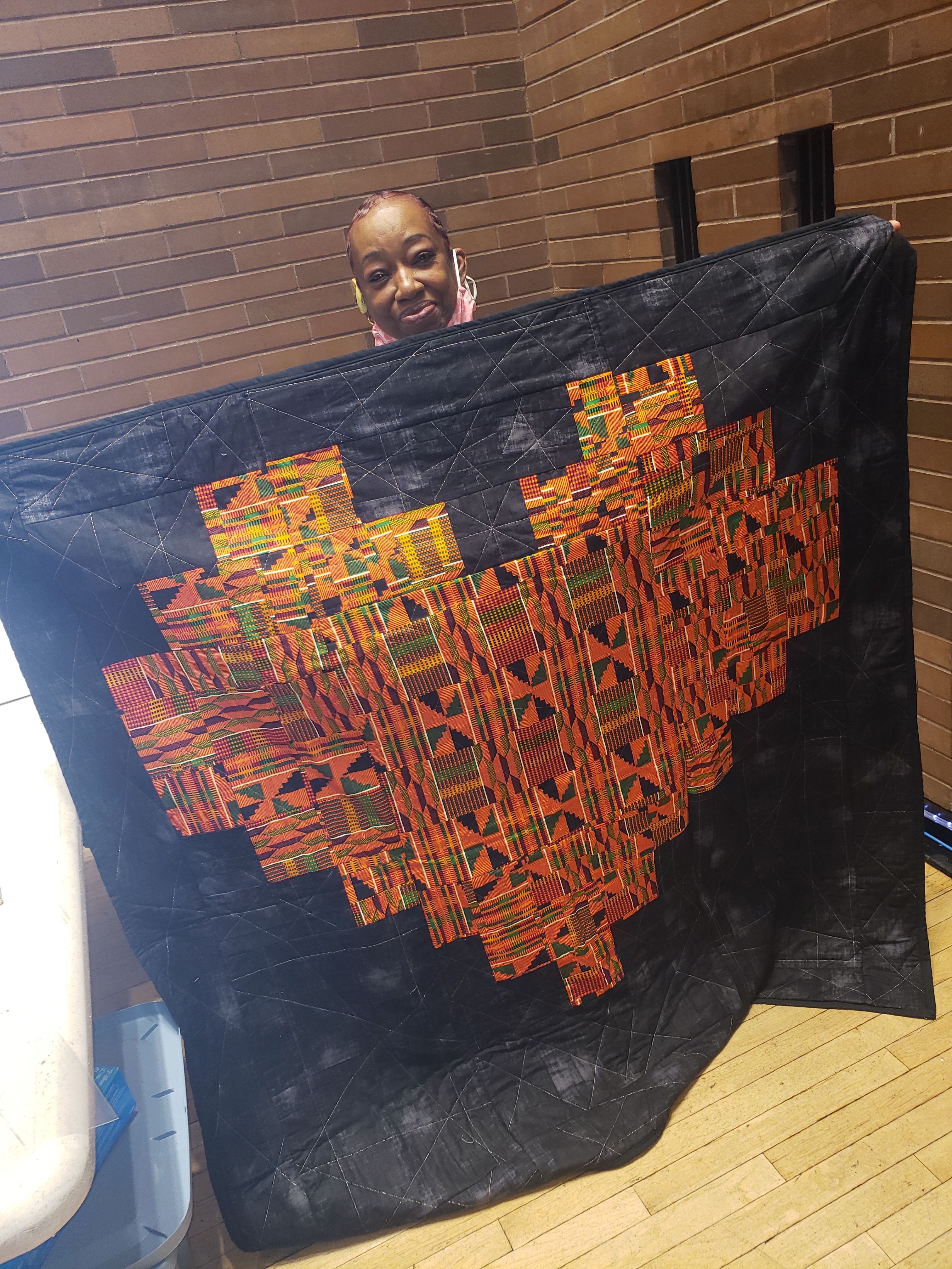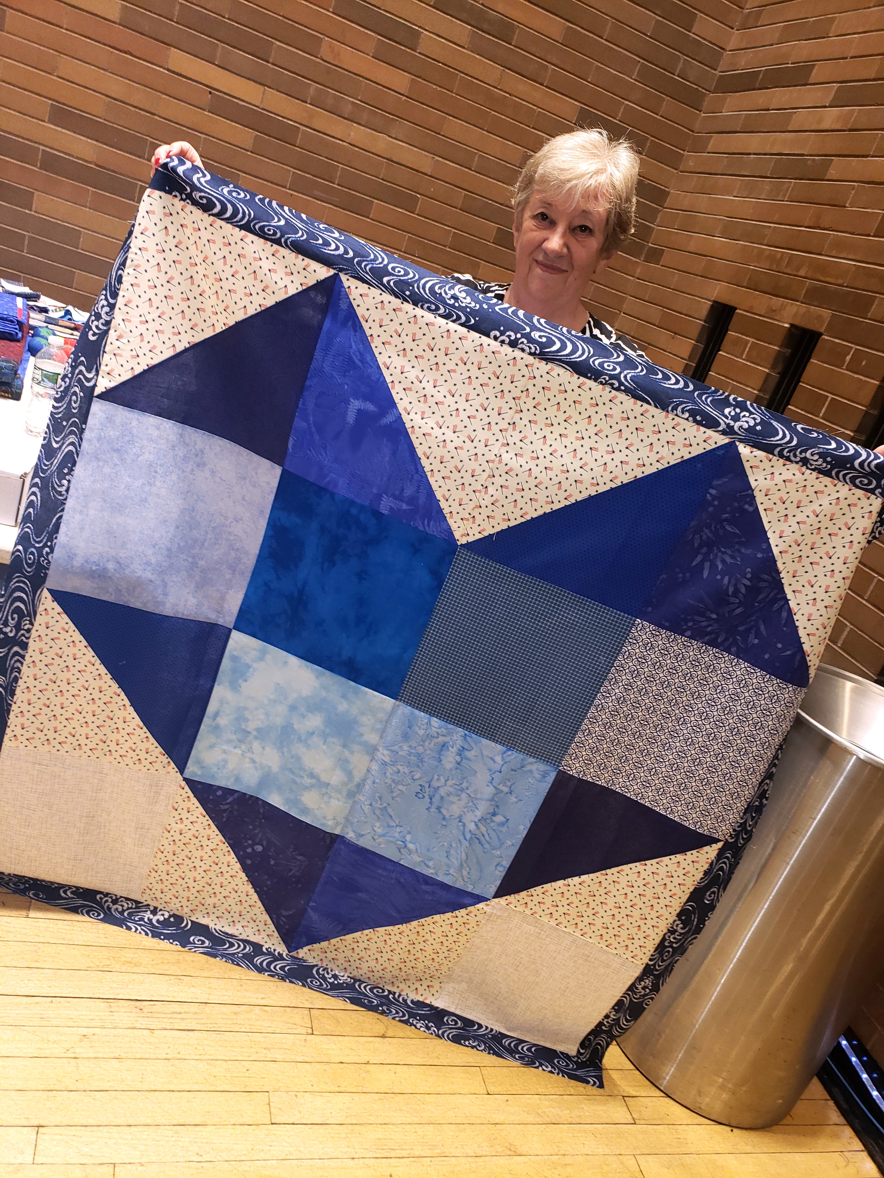 At the end of our quilting bee, we held our annual raffle for NYPD officers and a separate raffle for our quilters. Three 30×30 quilted wall-hangings and one 50×50 quilt were won by NYPD officers and 3 market totes were won by our quilters.